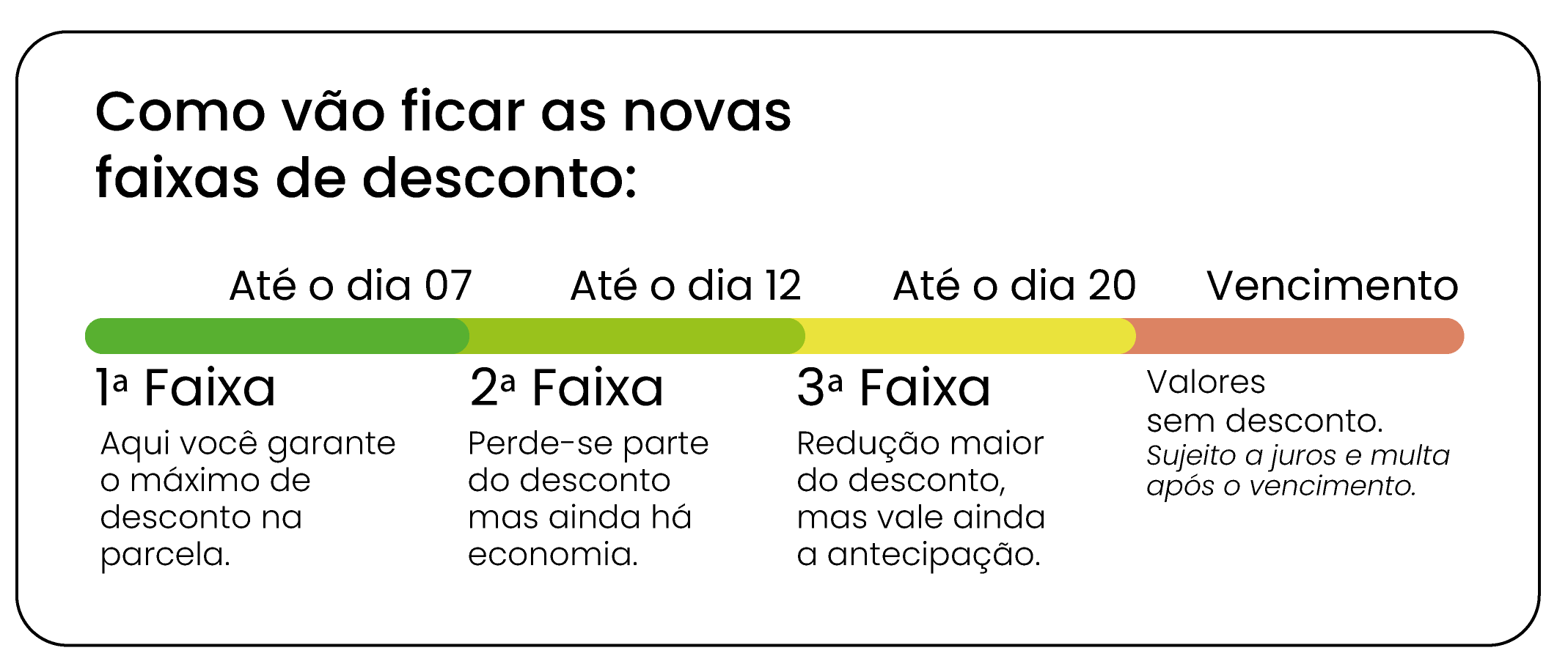 O reajuste de 8% será sobre o valor bruto da suas parcelas. Novas faixas de desconto: As novas faixas oferecem níveis variados de desconto nas mensalidades, conforme a data de pagamento. Elas incentivam quem paga antecipadamente com o desconto máximo, garantindo flexibilidade para ainda aproveitar descontos menores em datas posteriores