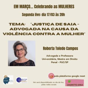 A transmissão está programada para o dia 17, quinta-feira, às 20 horas, horário de Brasília, pela plataforma Google meet. O evento é gratuito e será dedicado à promoção e defesa dos direitos das mulheres no mês destinado a elas. As inscrições podem ser realizadas através do whatsApp (34) 99770-6964. O link para participação será disponibilizado no dia da live pelas redes sociais.